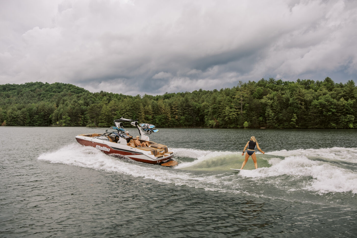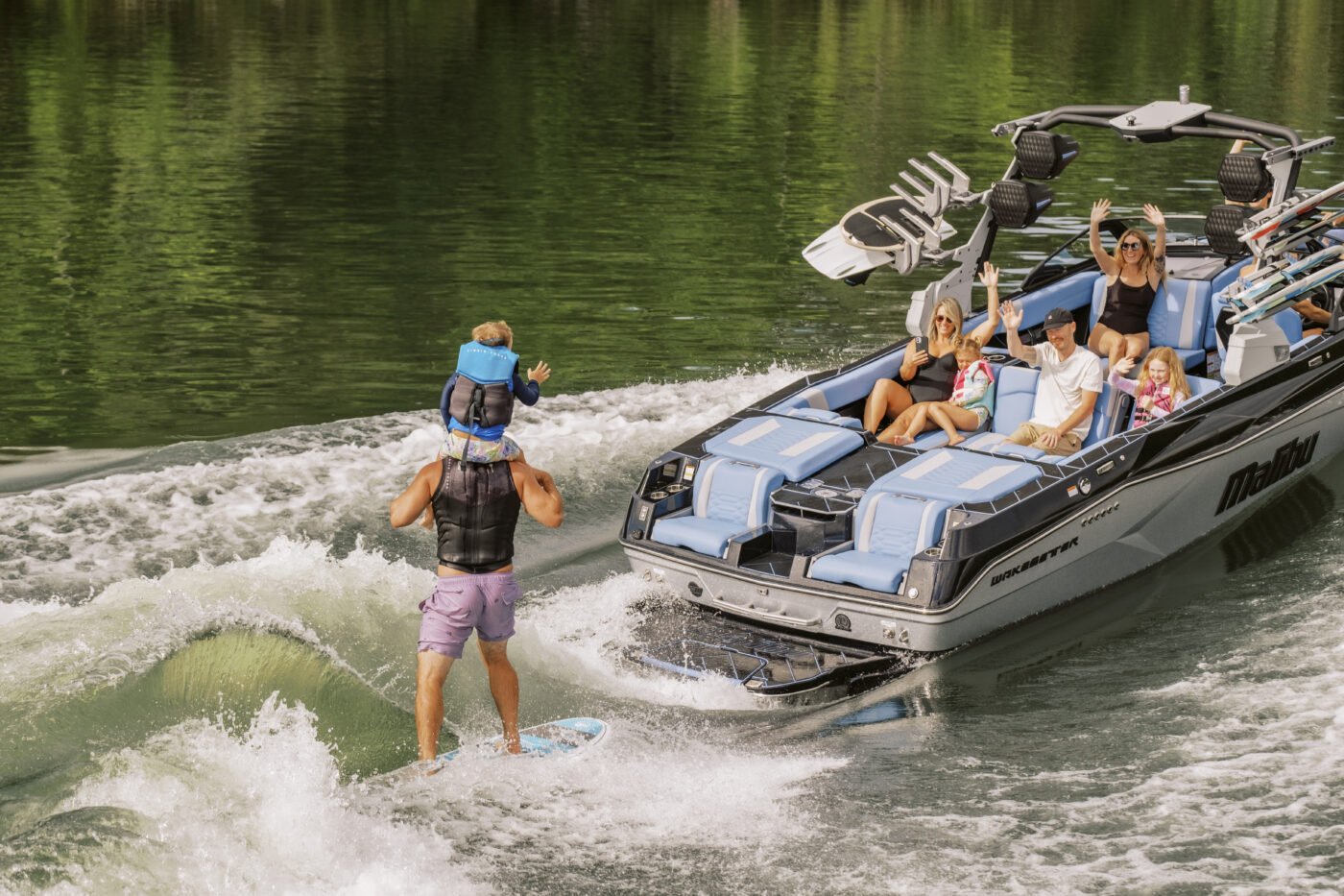 When paired with systems from Malibu Boats like the Power Wedge III and onboard ballast, riders can fine-tune wave height, length, and steepness.