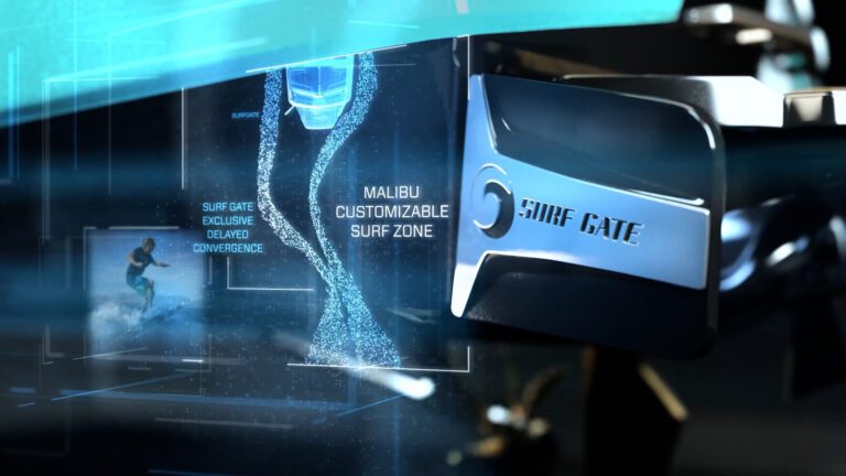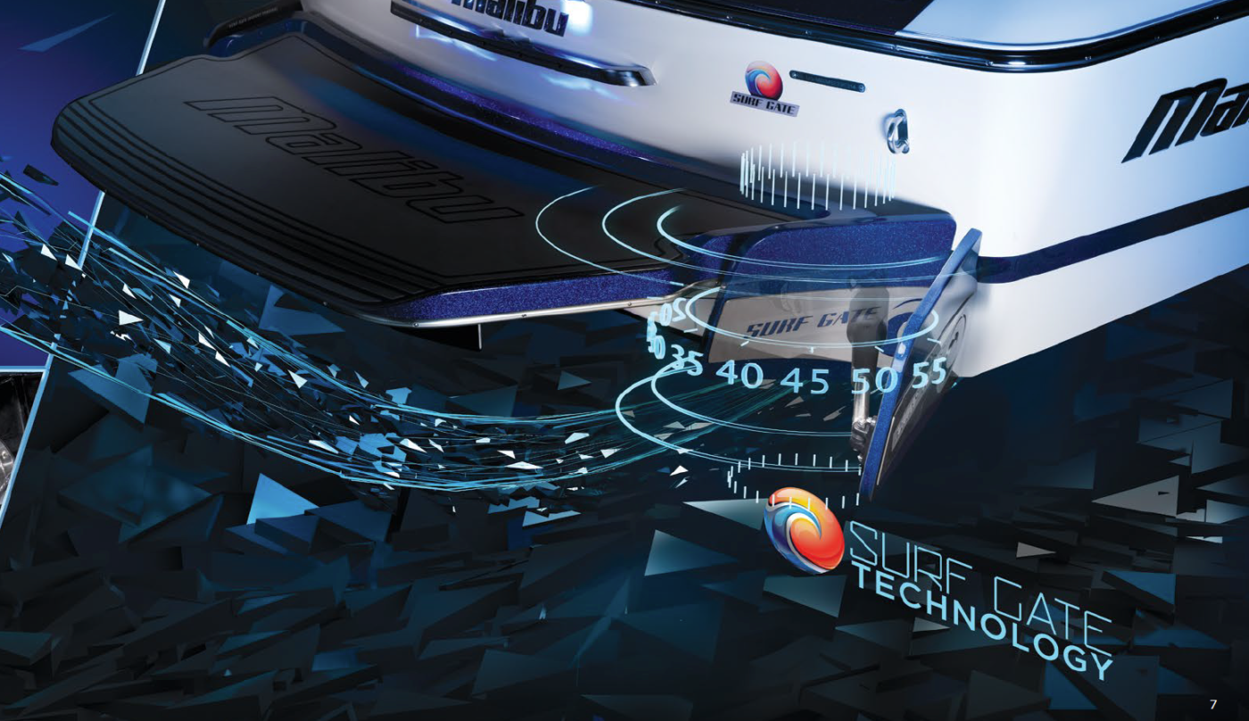 The Malibu Surf Gate, developed by Malibu Boats, is a revolutionary wakesurf system that changed the way surf waves are created behind a boat. Instead of requiring the boat to be heavily weighted and leaned to one side, Surf Gate uses hydraulically controlled panels mounted on the transom to redirect water flow and form a clean, powerful wave on either side. With the push of a button, riders can switch from regular to goofy without shifting ballast or passengers, all while the boat remains level and balanced. By combining smart engineering with precise water displacement, Malibu Surf Gate delivers a longer pocket, better push, and fully customizable wave performance — making it one of the most influential innovations in modern wakesurfing.